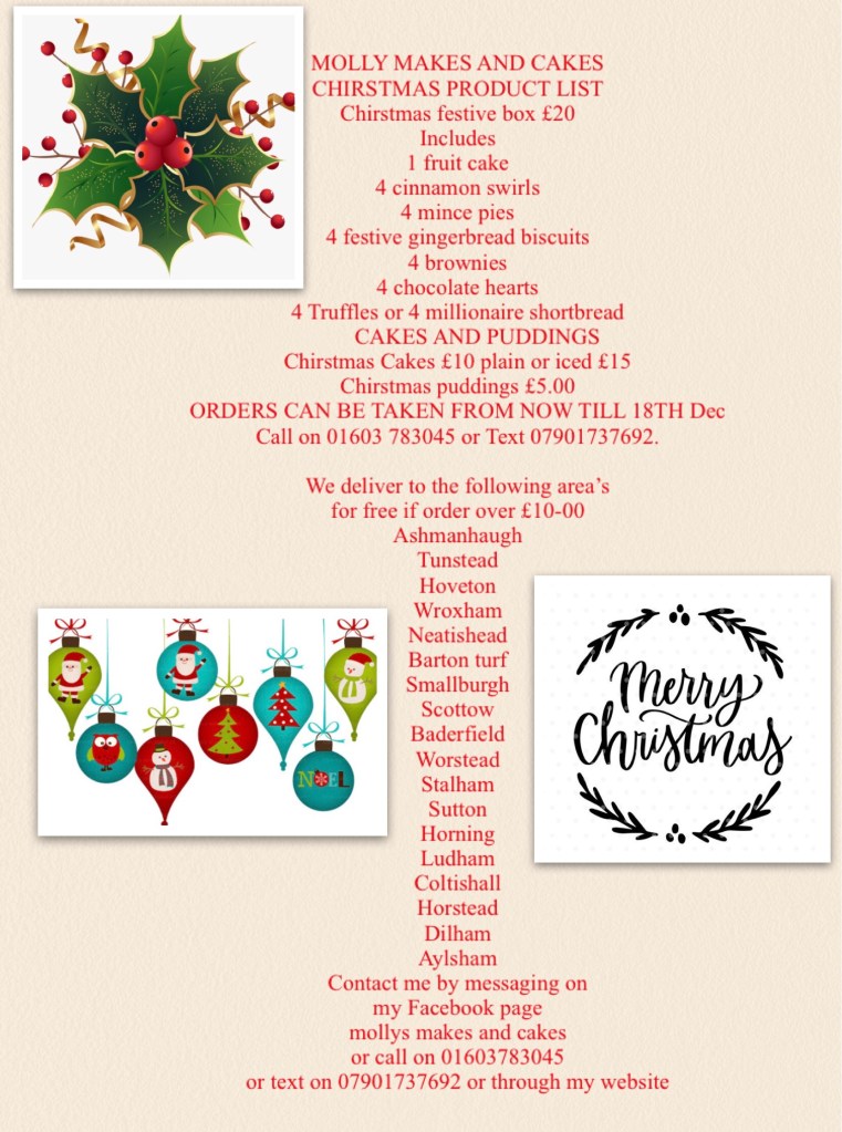 Contact me by messaging on my Facebook page mollys makes and cakes or call on 01603783045 or text on 07901737692 or through my website